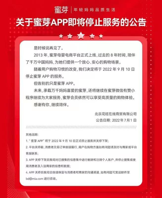 7月1日,蜜芽官网发布公告称,决定将于2022年9月10日停止蜜芽App服务。