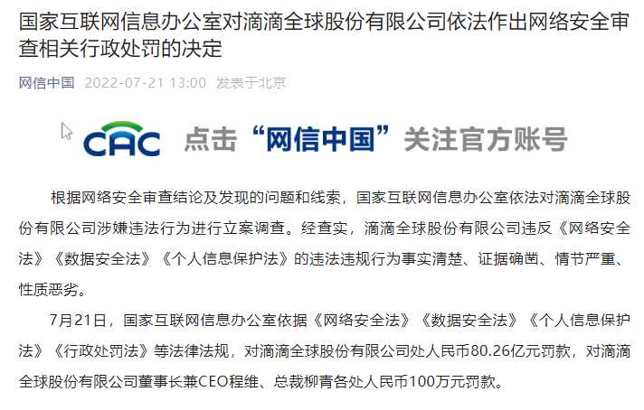 7月21日,网信中国发文称,国家网信办依据相关法律法规,对滴滴处80.26亿元罚款。此外,滴滴董事长兼CEO程维、总裁柳青也各被罚100万元。