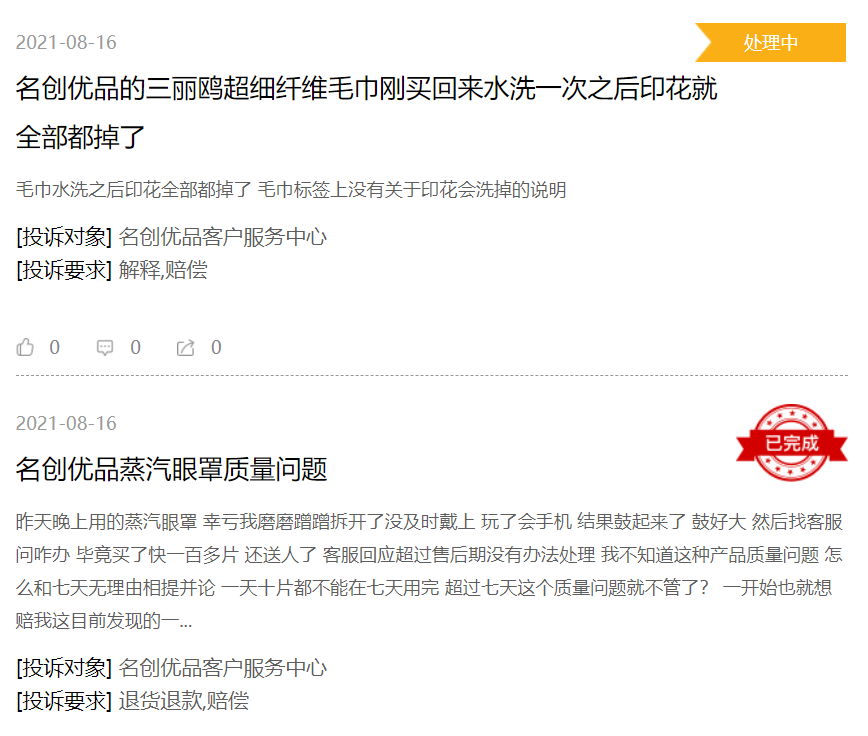 根据黑猫投诉平台的数据,共有390条有关名创优品的投诉。其中就包括了“化妆棉里有虫子”、“水杯是被用过的,有污渍”、“耳机质量有问题”等,还出现了用户“已换货一次,但仍存在质量问题”的现象。