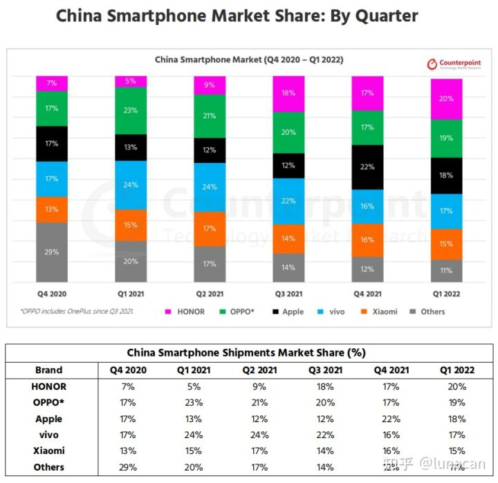 一方面,荣耀迅速崛起吃下了中低端的份额,今年一季度荣耀国内市场份额占比来到了20%,而去年同期这个数字仅为5%;