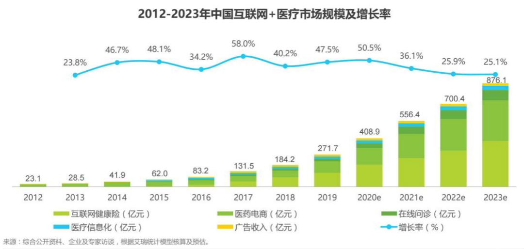 艾瑞咨询报告显示,2020年我国互联网医疗市场规模预计为408.9亿元,预计到2022年这一规模突破700亿元、2023年逼近900亿元。
