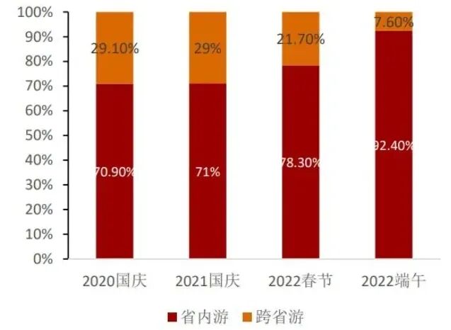 而“周边游”并非一时火热,自疫情暴发以来,国内主要节假日省内游的占比明显提高。据未来智库,省内游相比跨省游已形成“碾压”优势,比例高达92.4%。