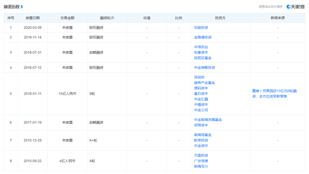 据天眼查显示,百果园在2015年9月获得了天图投资、广发信德、前海互兴等机构的4亿人民币A轮融资。