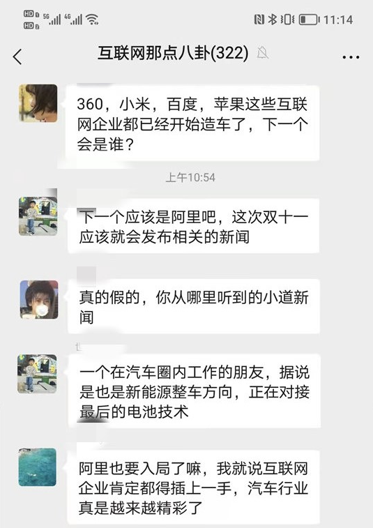 仔细看一下这张微信群截图,就会发现“天猫造车”的表述是有问题的。这位自称汽车圈内有朋友的用户,虽然提到了造车,但是主体一直是阿里。