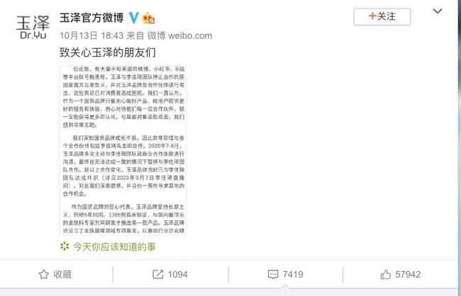 于是粉丝涌入玉泽的微博下,指责玉泽“忘恩负义”。玉泽不得不发布声明澄清,只是正常的商业合作。