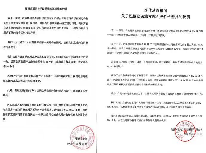 这一下得罪了两个头部主播,李佳琦、薇娅纷纷发出声明,一个表示暂停与巴黎欧莱雅旗舰店的合作,一个表示暂停与巴黎欧莱雅品牌任何形式的合作。