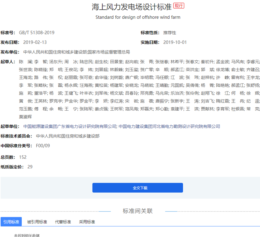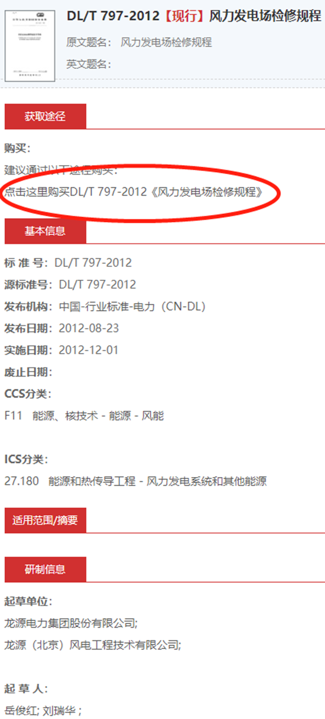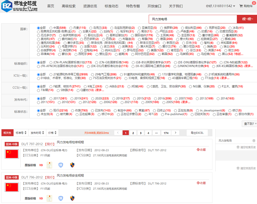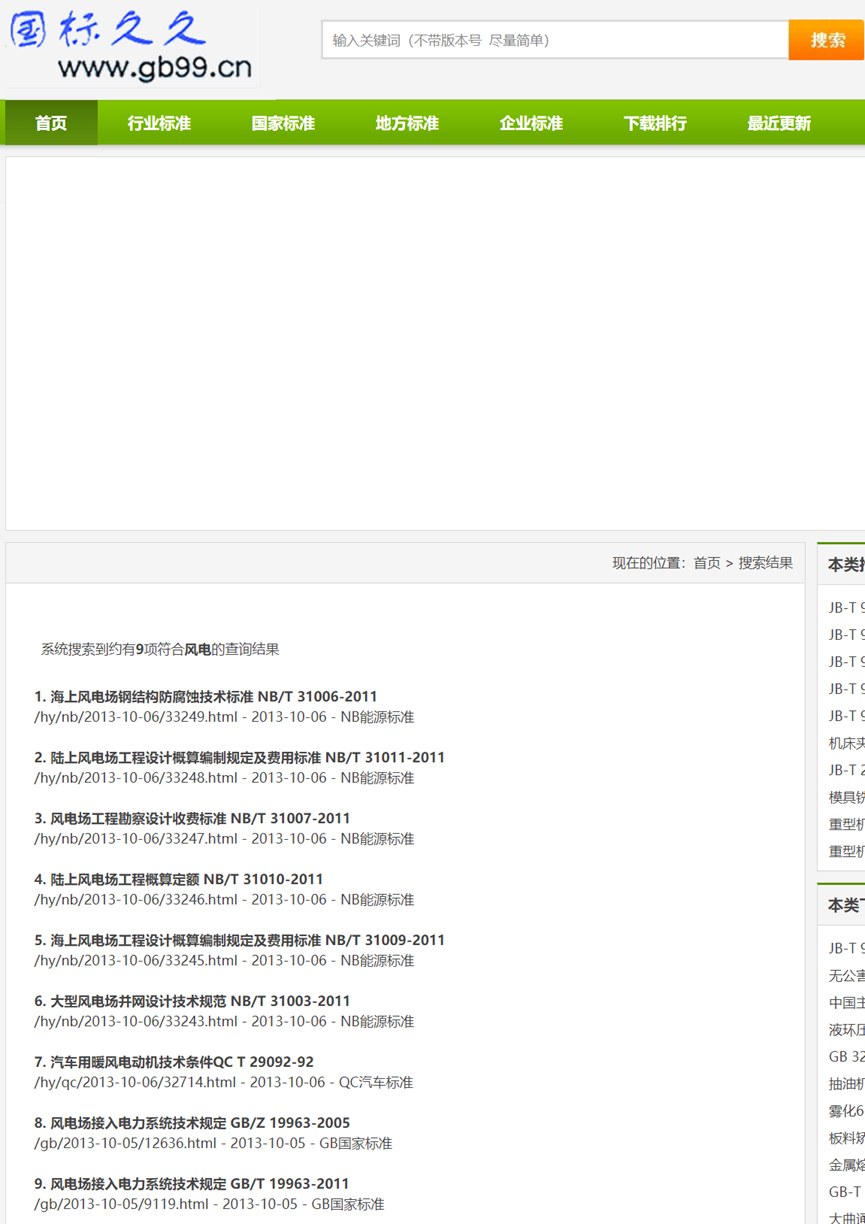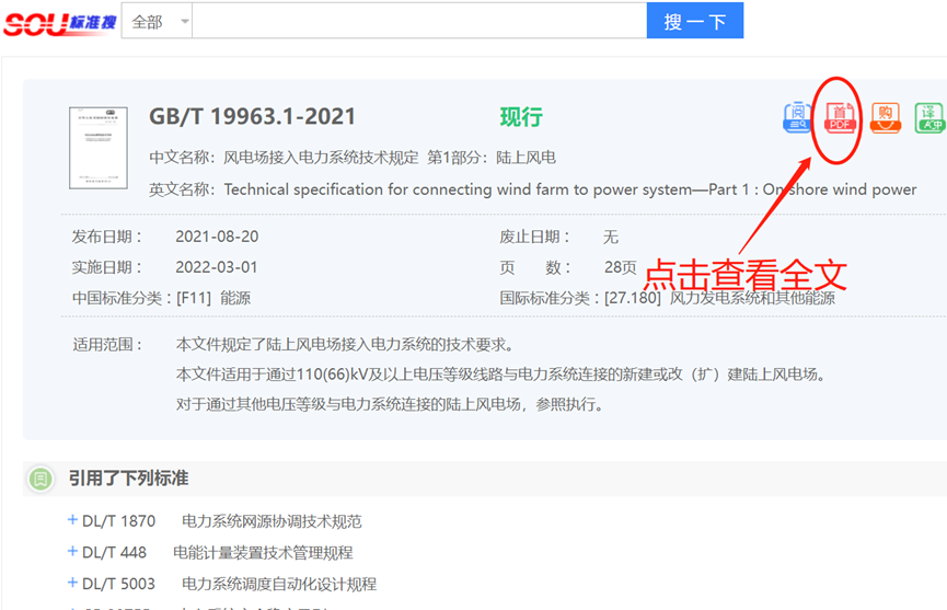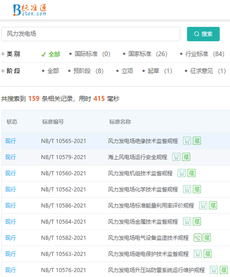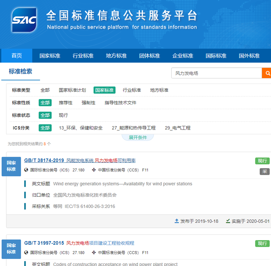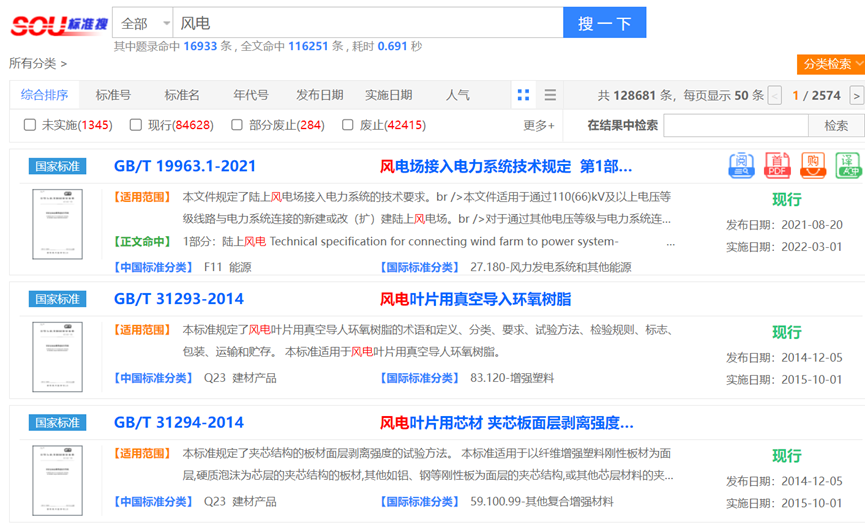 首先输入搜索关键词,比如“风电”,点击 检索,即可得到风电相关的各种标准。