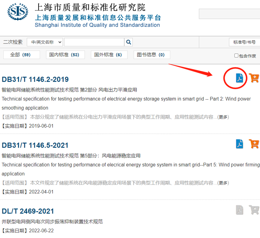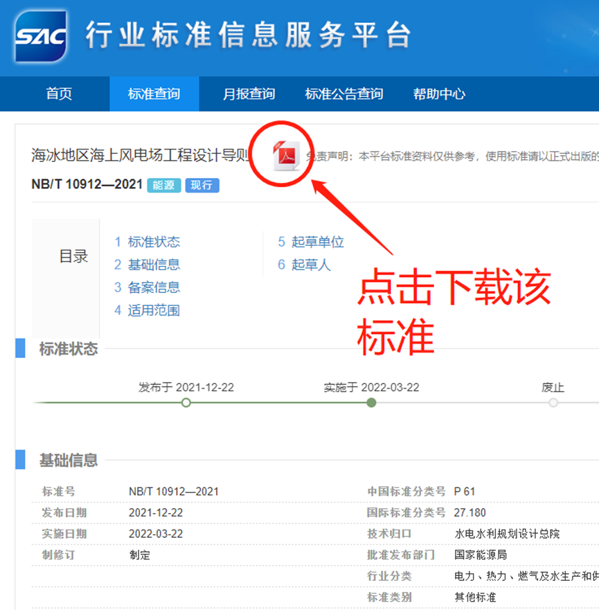 点击搜索出的某个标准,查看其详情,点击pdf图标,即可下载该标准的pdf文件。