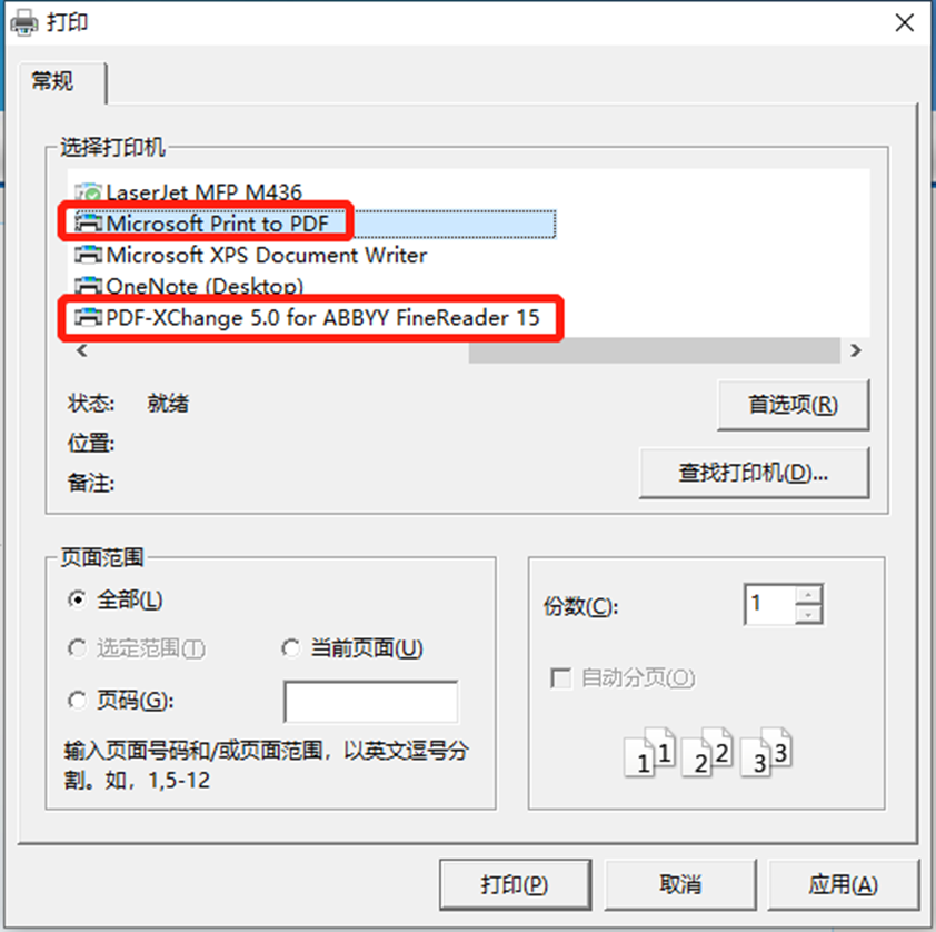7)打开之后,Ctrl+P启动打印,打印的时候选择打印成pdf文件,如下图所示。由于我电脑上安装了Acrobat和ABBYY,因此,我的打印机列表中有2个虚拟打印机,任选其一即可将任意文件打印成未加密的pdf文件,这样发给任何人都可以正常打开了。