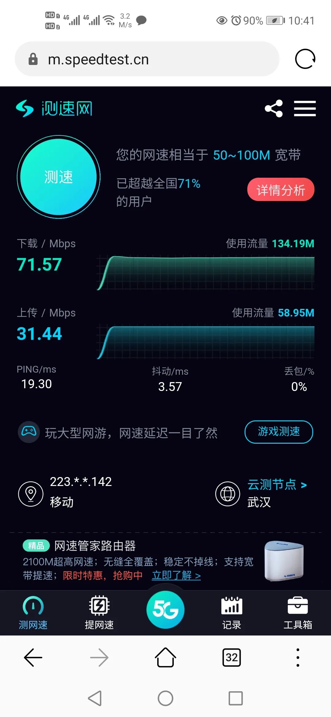 2)千兆路由器提供的无线网网速居然比有线网更高,估计是这无线网卡性能强劲吧,千兆路由器未全部发挥1000M的潜力,未来可以考虑购买更高的宽带套餐。