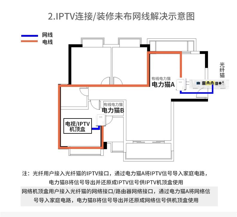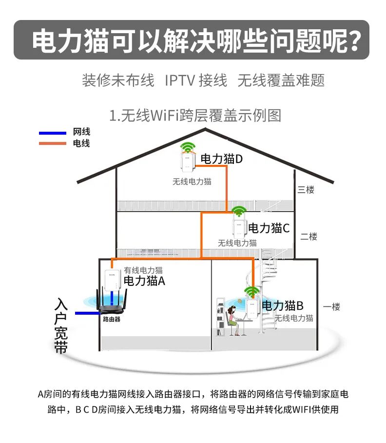 电力猫可以有线/无线自由组合,实现多房间、多楼层的网络覆盖,如下图所示。