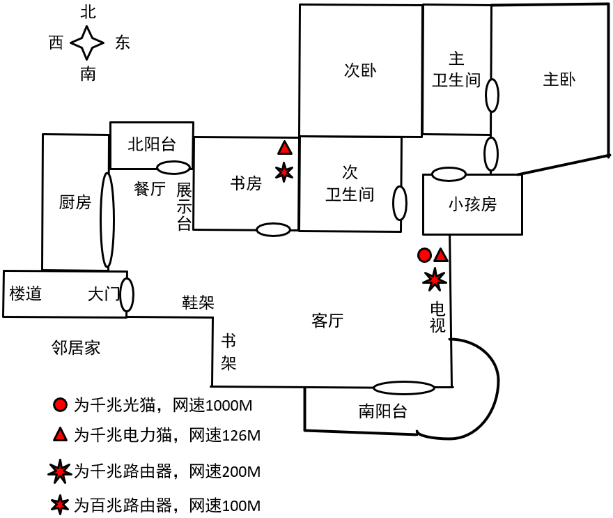 4)按图1布网,则家里将有2个网络中心(网速最快的地方),即千兆路由器和百兆路由器的位置,因二者连线恰好将全家等分为2份,故此布局可以使全家的网络信号最大化,达成目标3;