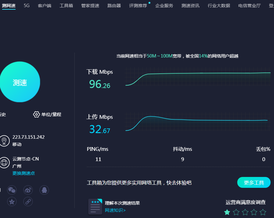 3)243Mbps的千兆有线网,经千兆电力猫传输之后,衰减为了126Mbps,再经百兆路由器传输之后,衰减为了96Mbps;由此可见千兆电力猫确实发挥了100M以上的作用,其带宽可能主要受限于电线,电线可支持的带宽上限可能就是126Mbps。未来升级可以考虑将这个百兆路由器换为千兆路由器。