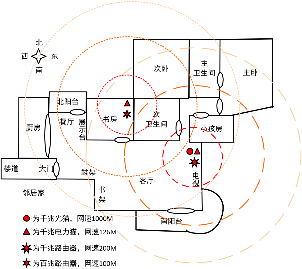 值得注意的是,房间各处真实的网速并非如上图所示随同心圆环外径衰减,因为空气对信号的衰减作用较小,而有些厚墙甚至可以屏蔽信号。