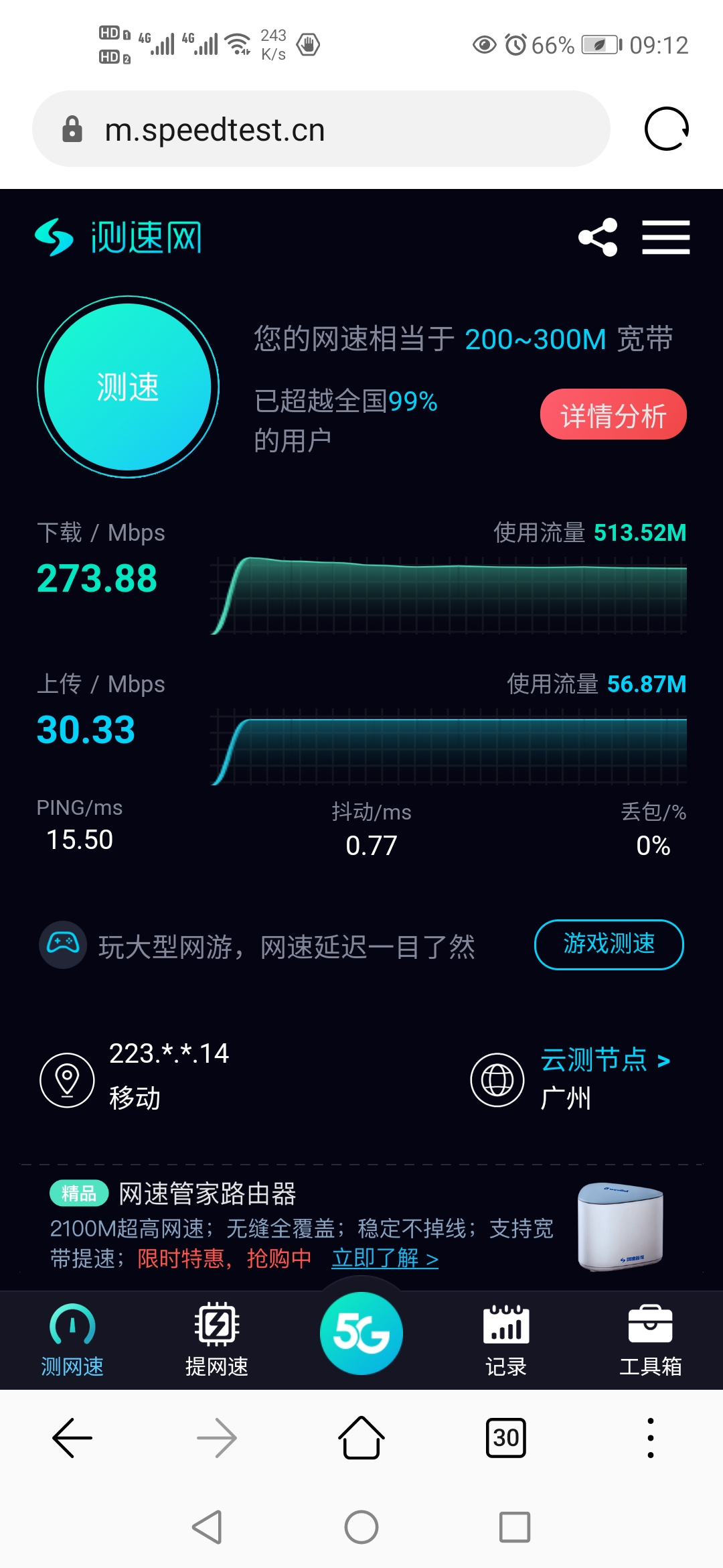 1)中国移动200M的宽带,实际网速可以达到273Mbps,即34MB/s,物超所值;在测试的初始瞬间可以达到500Mbps,从侧面可以看出,光纤入户的带宽为1000Mbps,是被光猫根据我购买的套餐强制限速成273Mbps的。