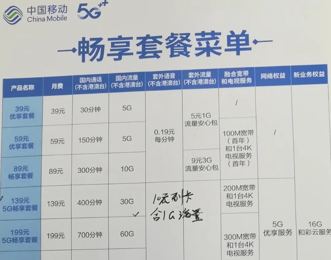 中国移动携号转网59元套餐,第1年月租39元,含200M宽带+150分钟通话+5G流量+光猫+4K网络电视盒子,免宽带安装费,充100元送200元话费。如果担心这些套餐条件最终无法兑现,可以跟宽带经理聊天时全程录音,我就是这样做的。
