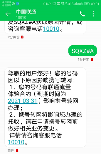 我回答说“你先别挂电话,我查询确认携转限制条件真的取消了之后你再挂”,随后我发SQXZ短信查询自己的携转资格,确认自己能携转之后挂了电话。