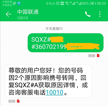 先礼后兵,首先,我发送短信SQXZ#姓名#身份证号给中国联通(SQXZ是申请携转的拼音首字母),查询自己是否具备携转资格,如下图所示。