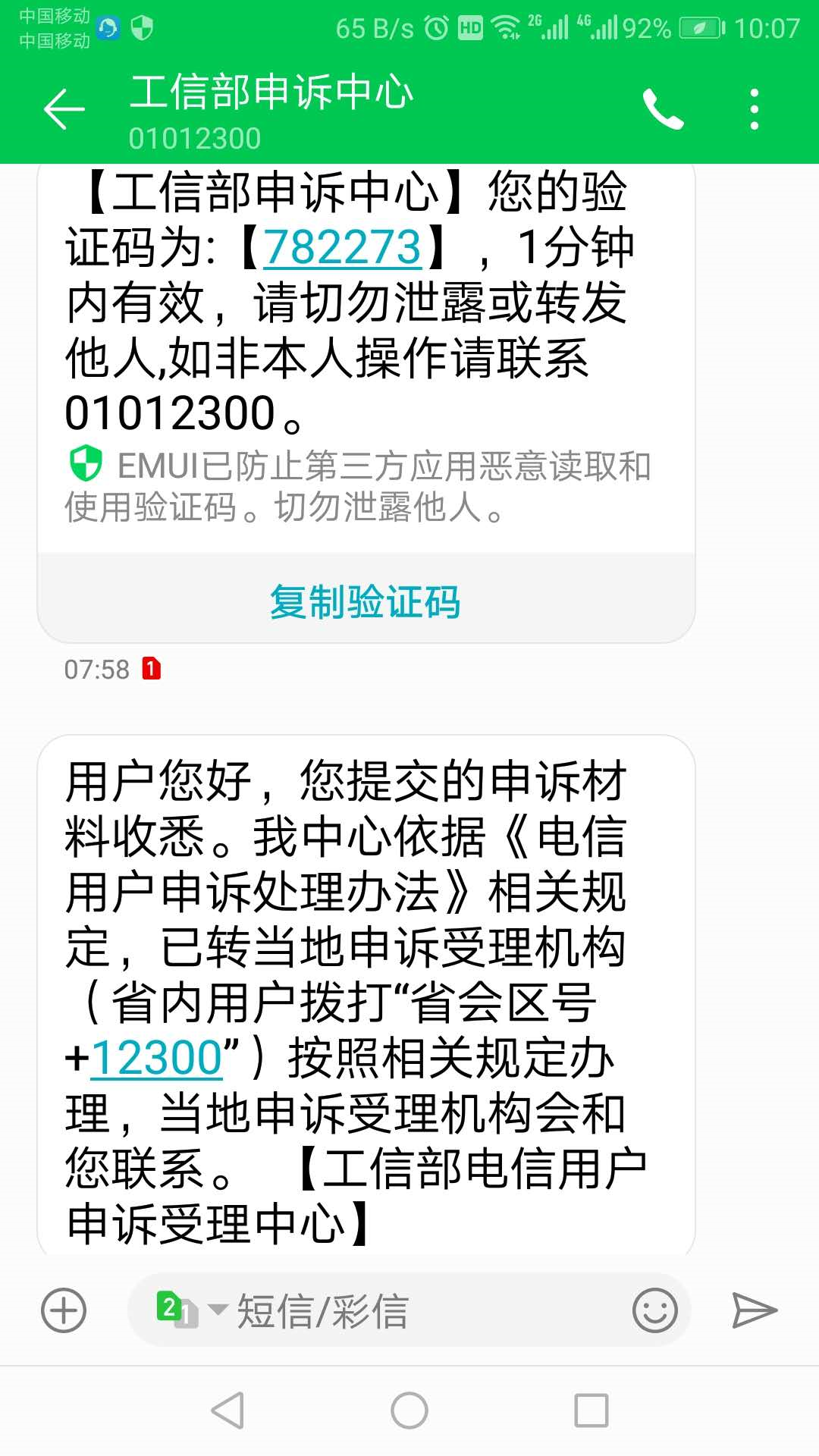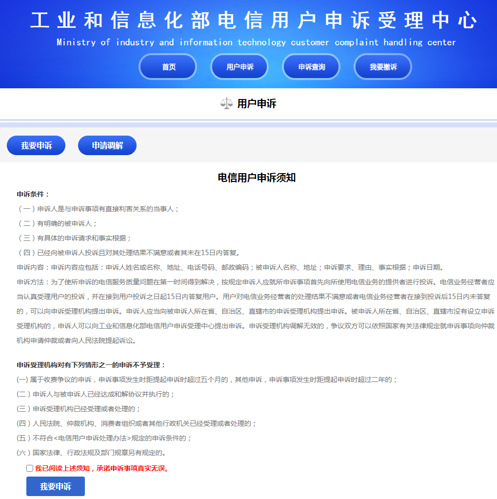 第2天早上7点,我再次发SQXZ短信查询自己的携转资格,发现那个限制条件依然在。这回我真是怒了,直接打开工信部投诉网页——https://dxss.miit.gov.cn/yhss/