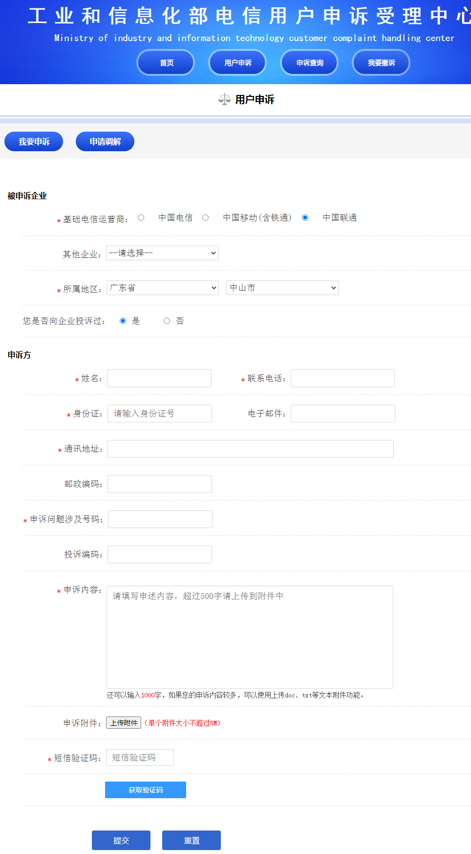 在上图所示网页中如实填写自己遇到的问题(只有带星号的是必填项),然后获取并输入手机短信验证码,点击提交就可以了。
