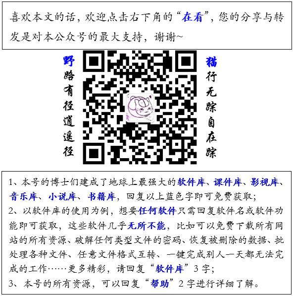 由于定位不同,因此本号不可能像其它公众号一样每天推送软件工具,而且软件都是用来用的,用最少的软件完成最多的任务才是王道,整太多软件反而浪费时间。因此,本号利用野猫软件榜评选各领域最强的软件,用野猫软件库来维持各个软件至最新无限制版。