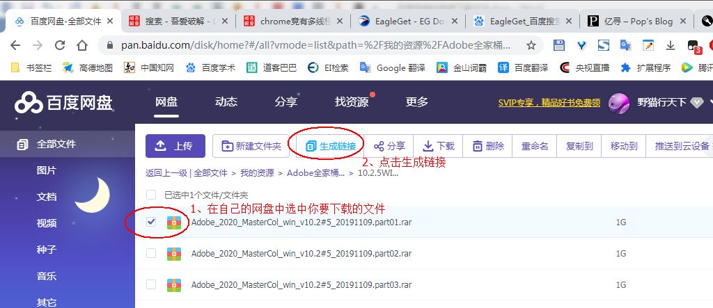 7)在浏览器中打开自己的百度网盘(网页版),选中你要下载的文件,然后点击“生成链接”按钮,如下图所示。