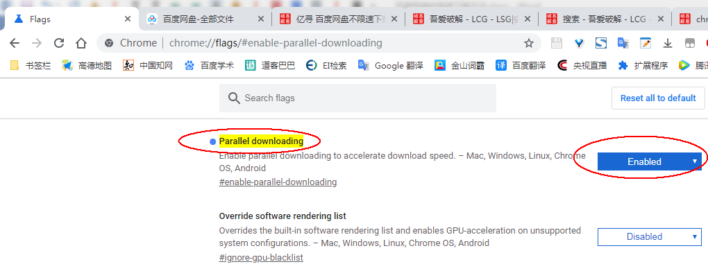 值得一提的是,Google浏览器自带了多线程下载功能,需要大家手动开启。如下图所示,在浏览器的网址栏输入chrome://flags/#enable-parallel-downloading然后回车,点击Enabled可以启用多线程下载功能。