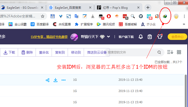2)安装IDM软件,安装时它将自动给你的浏览器安装扩展程序,使浏览器的工具栏多出一个IDM下载按钮,如下图所示;