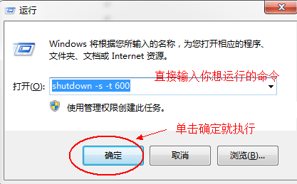 根据以上帮助信息我们会知道,如果输入shutdown –s,回车之后电脑就会关机;如果输入shutdown –s –t 600,回车之后电脑就会在600秒后关机;如果输入shutdown –a,就可以在实施关机之前中止关机。这些命令除了可以在这个黑色的cmd.exe界面里执行,还可以在刚才的“运行.exe”界面里执行。