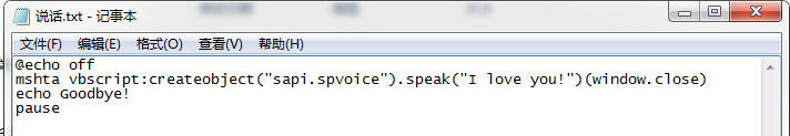 打开记事本之后,我们就可以直接在里面编写脚本程序,通过组合多个cmd命令,来实现一些复杂的功能。比如下面是1个比较简单的脚本程序,它可以实现让电脑说话的功能。