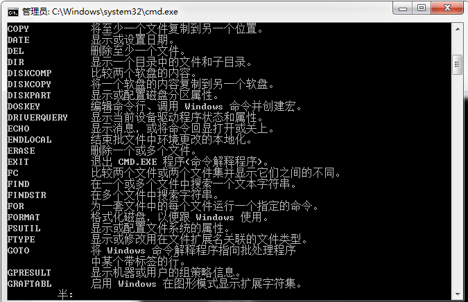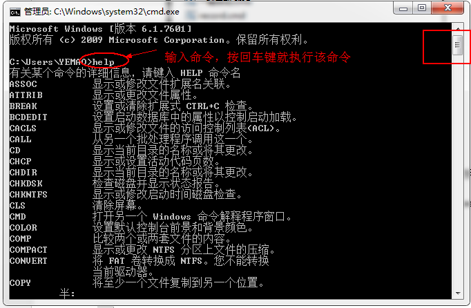 比如我输入help四个字母,然后按回车键,就可以执行帮助命令,获取cmd.exe可以支持的所有命令、及其功能。