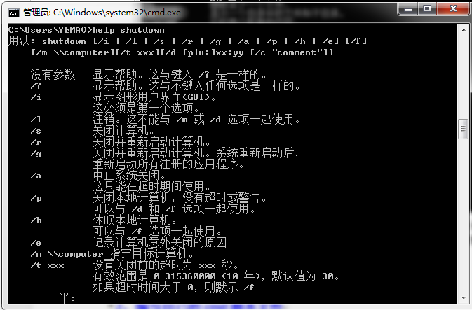 而要查看某一个命令的详细信息(功能和使用方法),可以输入该help+空格+命令名称,比如我想查看shutdown命令的功能和使用方法,就可以输入help shutdown,然后按回车键执行,得到下图所示结果。