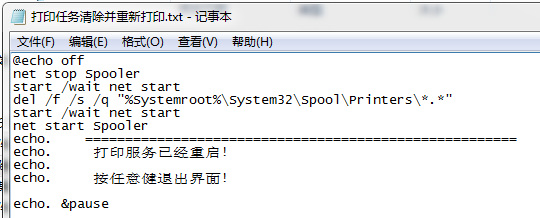 又比如下面这个脚本程序,它可以实现“打印任务清除并重启打印服务”的功能。