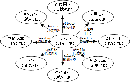 从上图可以看出,此方案是星型的、单中心的,平时数据只会从中心(主台式机)流向四周(副设备),实现数据的单向同步备份。在意外发生后,数据会从四周流向中心,实现数据的恢复。