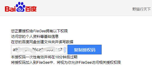 5)复制授权码,将授权码粘贴至FileGee的授权码栏里,点击进行授权,然后软件会提示授权成功。授权成功后就可以选择你的百度网盘的某个文件夹用来保存同步过来的数据了。