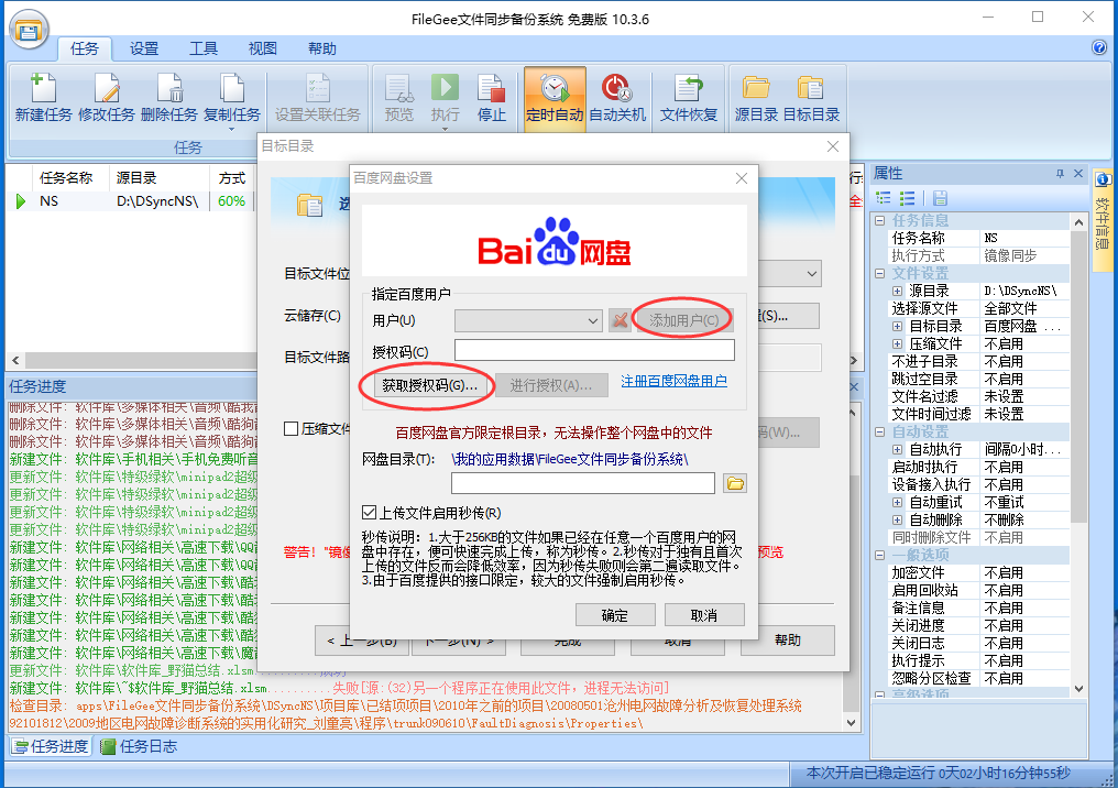 4)确认浏览器已经登陆了你的百度账号之后,就可以回到FileGee软件,继续之前的操作,点击下一步,选择云存储、百度网盘,点击详细设置,然后点击添加用户,点击“获取授权码”。