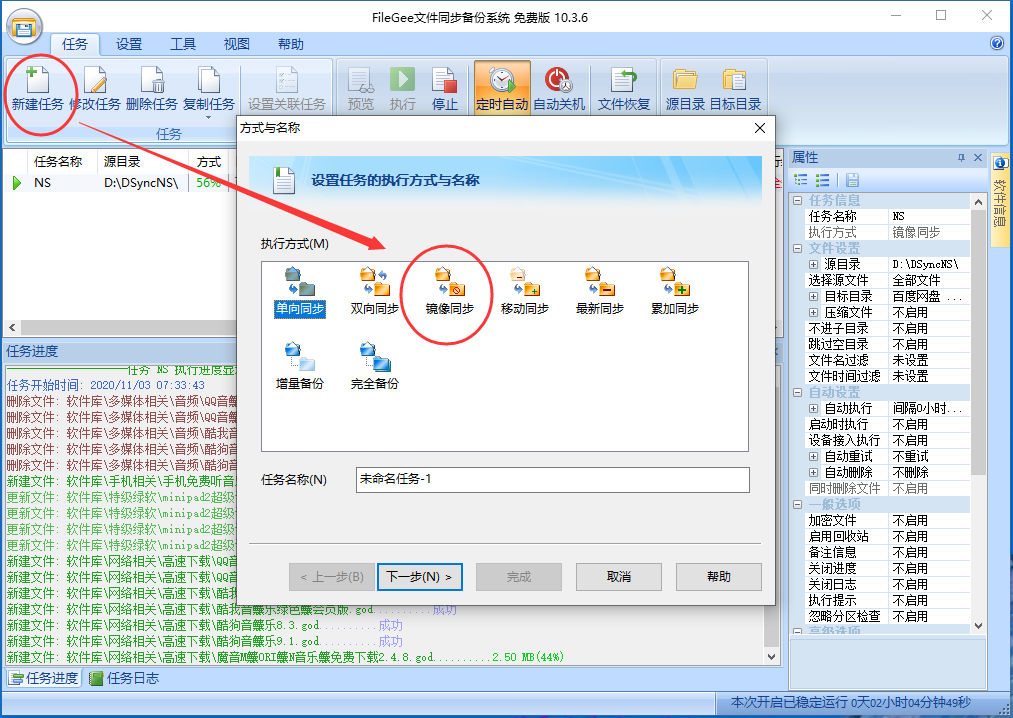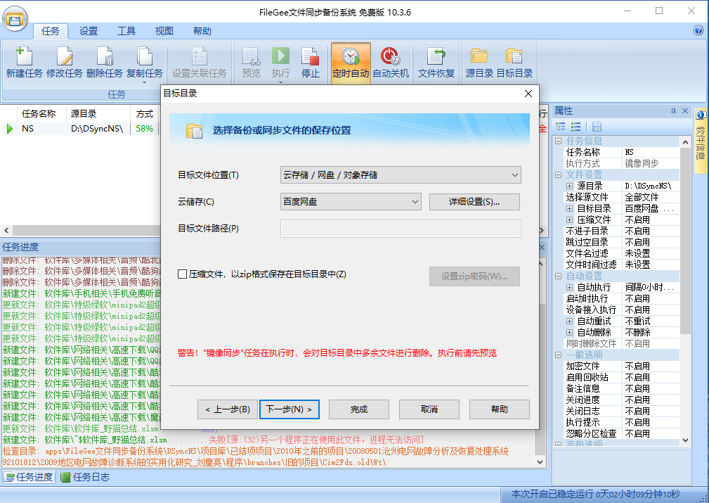 7)下图是我设置好的一个同步任务,可以看出,该任务是将D盘上的DSyncNS文件夹镜像同步至百度网盘的同名文件夹中,同步间隔是10分钟。
