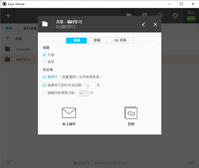 4)设置好失效时间(也可以不失效)、可供使用次数(也可以不限制),是只读(单向同步)还是读写(双向同步),推荐选择只读(单向同步);