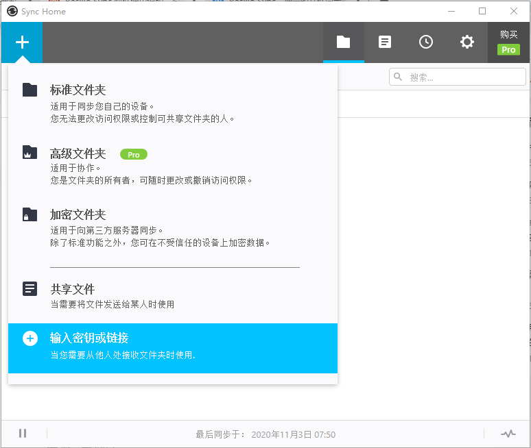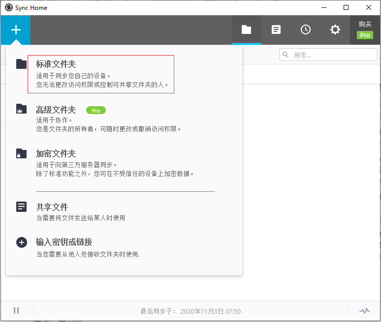 2)然后在A电脑上打开Resilio Sync软件,点击左上角的+号,新建1个标准文件夹;