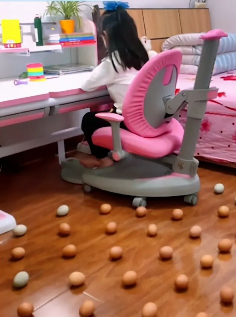 直到她看到自己的周围,排满了鸡蛋,半步一个,如果她还想离开书桌去干啥,必须要小心翼翼地穿过这个“鸡蛋阵”。