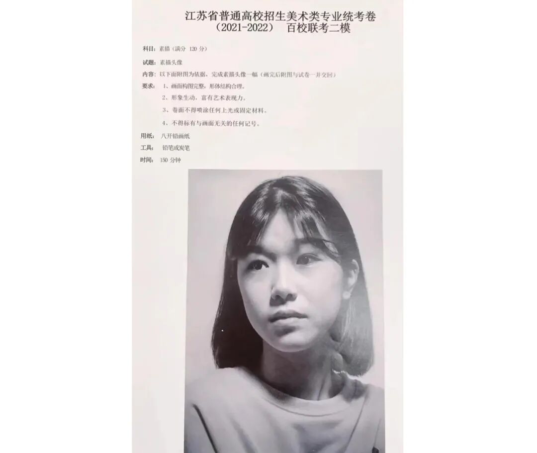 题目要求按照参照图,使用铅笔或炭笔,在150分钟内完成一副生动形象、富有艺术展现力的素描头像,满分120分。