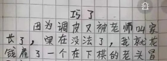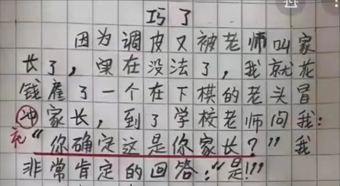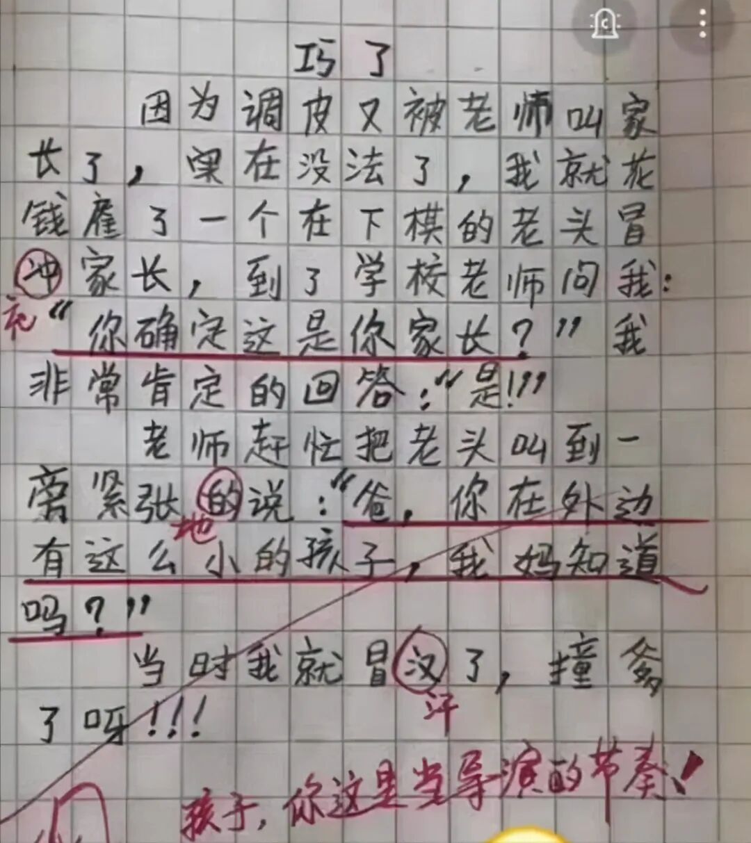 这不,就有一个小朋友,把“叫家长”的经历写成了一篇小作文,名为《巧了》。