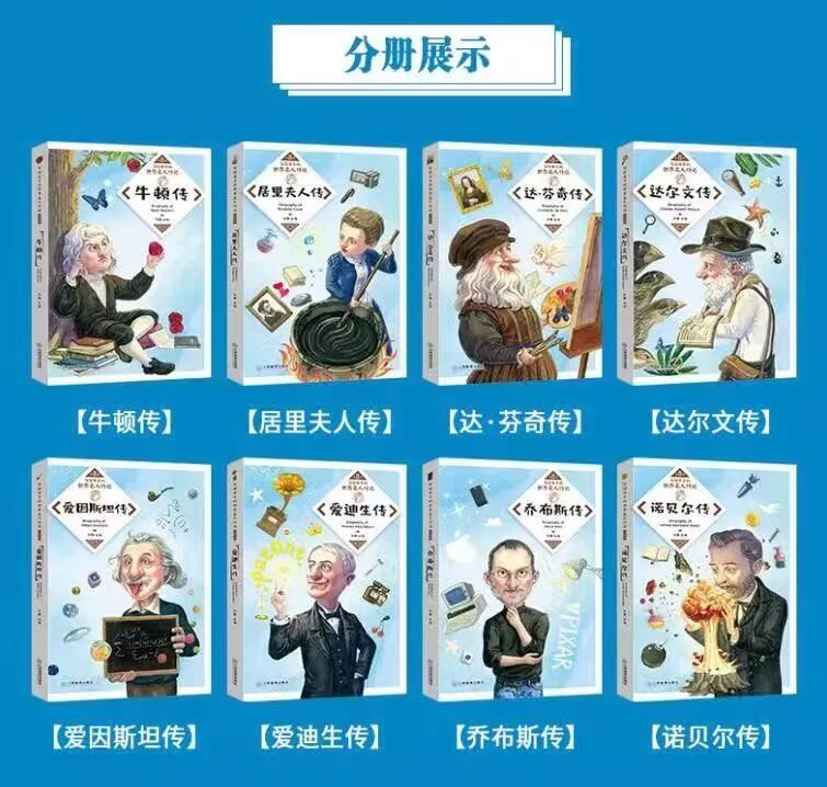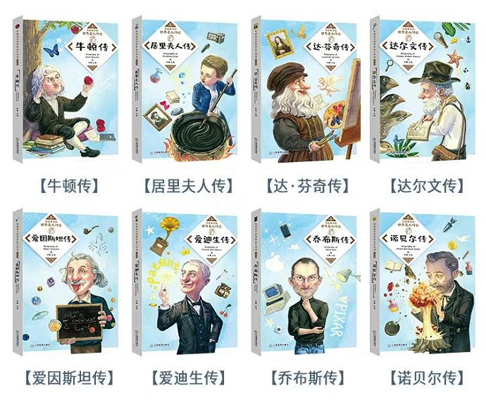 包括《达芬奇传》、《达尔文传》、《爱因斯坦传》、《爱迪生传》、《乔布斯传》、《诺贝尔传》、《牛顿传》、《居里夫人传》。