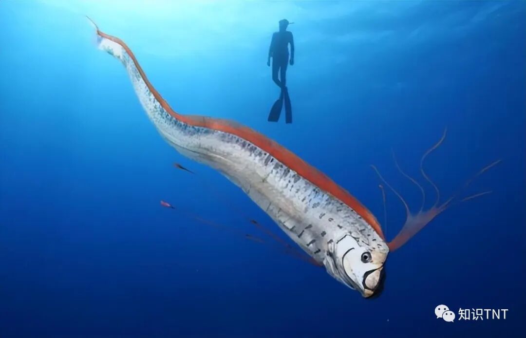 皇带鱼是月鱼目,皇带鱼科的一种大型鱼类,成年后体长普遍在3米以上,重量可以达到近300千克。2014年在墨西哥科尔蒂斯海滩浅水区,人们发现了两条长达15.2米的巨型皇带鱼,它们的出现吓坏了海滩上的游客,这也是迄今为止世界上已发现的最大的硬骨鱼。皇带鱼身体细长,与其他带鱼一样整个身体呈彩带状,身体无鳞片,头顶长着丝状的背鳍,就像是皇冠一样。它们主要生活在太平洋与大西洋的深海区域,平时在200米以上的海域很难见到,它们性情凶狠,会捕食各种小鱼小虾,有时也会出现同类相食的情况。皇带鱼全身银白,头顶彩冠,身形矫健灵活,很多人都认为它们很有可能就是古代蛟龙的原型。而更加巧合的是,在世界各地都有着皇带鱼能带来地震或是海啸的传闻,它们的另一个称呼便是“恶魔的使者”。