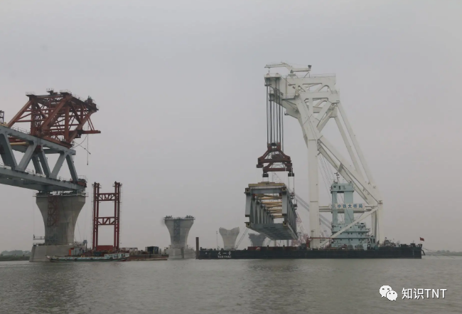 再使用了超大功率的液压打桩锤,累计锤击次达2060万次,将巨大的钢管牢牢钉入河床中,打下了坚不可摧的地基。地基建成后就开始架梁了,要如何将3200吨的主桥梁架上去呢?
