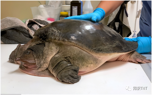 佛罗里达鳖是一种原产自美国的大型软鳖属动物,也可以叫作珍珠鳖,1993年作为肉食龟被我国引入。它们贝壳光滑椭圆,裙边厚实,背壳呈暗绿色,上面带有黑色色斑。佛罗里达鳖的鼻管很长,腹部是全白色的,四条腿粗壮有力,脚上有蹼,善于在水中游泳。它们喜欢生活在江河、湖泊的淡水水域中,以各种小鱼小虾和蚌、螺等水生生物为食。佛罗里达鳖平时喜欢在阳光明媚的天气里到岸上晒太阳,或者直接浮在水面上让贝壳露出来接受阳光。