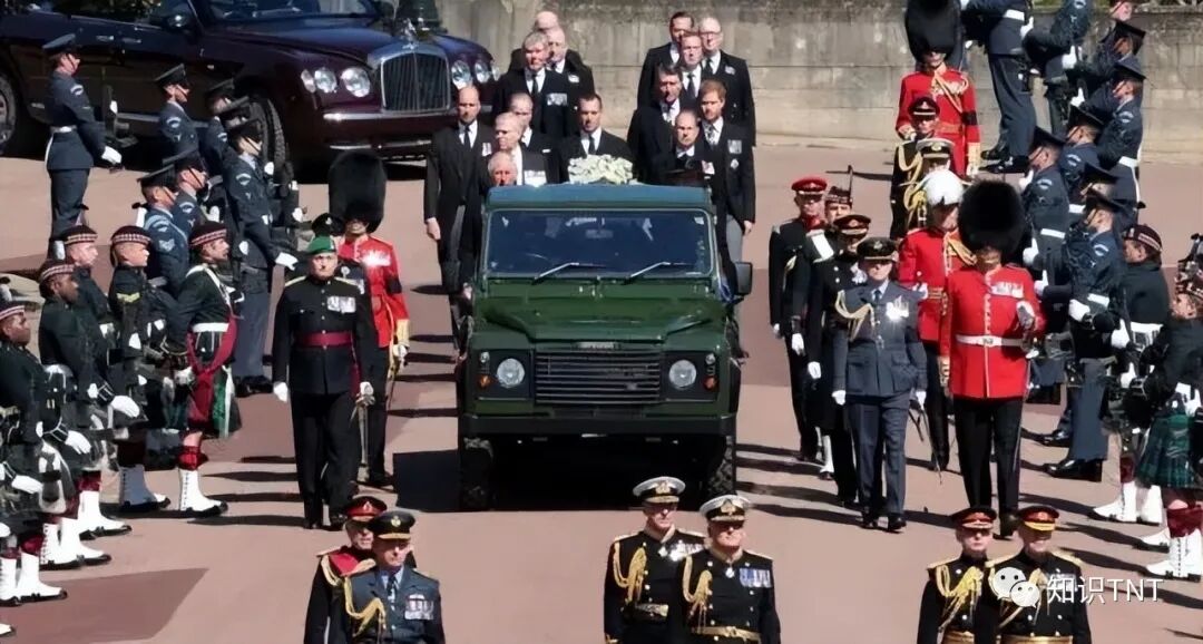灵车是由路虎改装的,由菲利普亲王设计,送葬的人员走在棺材后面。查尔斯王子和安妮公主走在前面,随后是爱德华王子和一众王室成员。