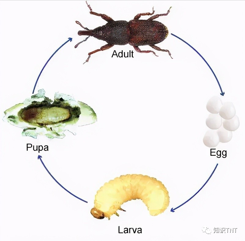 从虫卵开始,米象要经过卵,幼虫,蛹以及成虫四个阶段。米象的卵呈一种半透明的乳白色,进入繁殖期后,它们会挑选饱满结实的米粒进行产卵。米象的寿命只有短短的几个月,但只要成年后它们就会疯狂地繁殖,米象一年就可以繁殖出8-9个世代,一次产卵就能达到300-500颗。这样的繁殖速度让米象无论在多么艰苦的环境下,都能够轻松地保持住种群的数量,等到条件适宜后就会大面积爆发,也就是我们日常看到的“粮食生虫”。米象会在米粒上钻一个小孔然后掏空,将卵安置好后,它们就从身体里分泌出一种特殊的胶质物,对破损的米粒进行“修复”,从外面看出来这些米粒仍旧完好无损,小米象也就有了一个安全舒适的育儿房。