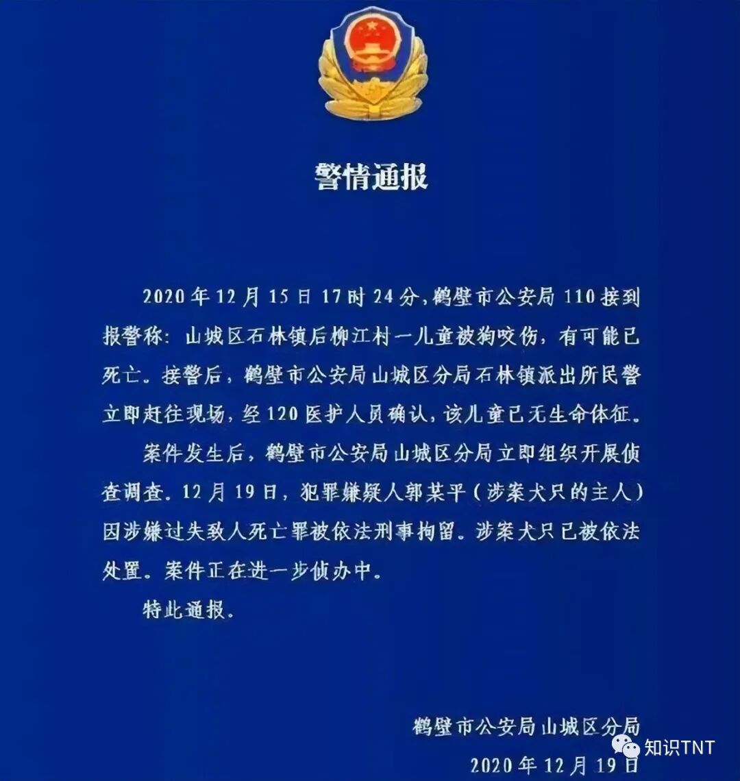 当日17时24分,河南省鹤壁市警方接到报案,报案人称山城区石林镇后柳江村一名儿童被狗咬伤。