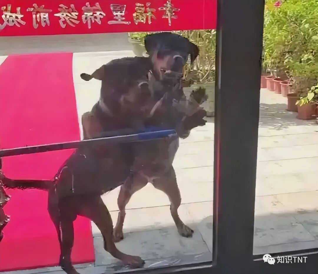 售楼部保安将玻璃门关紧,不断对两只恶犬做出驱赶的动作,哪知两条罗威纳面对人群并没有退怯,反而两只前腿扒在门上,紧盯女孩的同时还不断发出令人胆寒的吠叫。